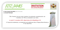 Jean-Claude Pellerin, Maire de Fitz-James, et le conseil municipal, ont l’honneur de vous inviter à assister à la cérémonie commémorative de l’armistice de 1918, au monument aux morts.