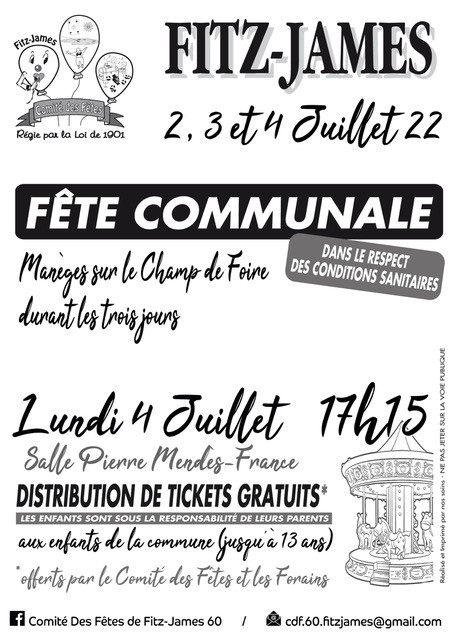 Le lundi 4 juillet à 17h15 aura lieu une distribution de tickets gratuits (offerts par le Comité des Fêtes et les Forains) aux enfants de la commune (jusqu’à 13 ans).