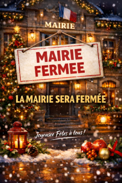 La Mairie sera fermée à partir de 12h, les mercredis 24 et 31 décembre 2025, ainsi que toute la journée des vendredis 26 décembre 2025 et 2 janvier 2026.